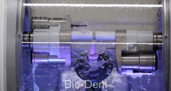 V konečné fázi výroby, automatizovaná a vysokorychlostní fréza frézuje z celého inlay/onlay nebo keramické korunky s přesností na setinu milimetru. Po pouhých 10 minutách je korunka připravena.